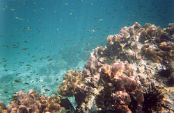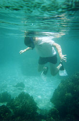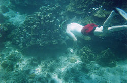 We waded into the warm water, slipped on our flippers and floated out to the deeper water where the fish were. The sandy bottom turned to coral after about fifty feet, then started getting pretty deep after that. It wasn't exactly the Great Barier Reef, but the variety of coral and fish was a bit more than Maui. Tree and rock coral were all over the bottom making a nice maze to swim through, at ten to fifteen feet deep. Small fish were everywhere and one of the yellow ones bit Chad when he got too close to his little home.