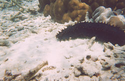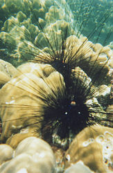 Farther out, big fish started showing up, including gars, morey eels, wrasse, and at the edge of the reef we swam past a 5-foot reef shark. Most interesting of all were the black sea urchins. With 10 inch black spines, fluorescent blue and green hair, and a protruding orange mouth on the top of its head that looked like a big eyeball poking out.