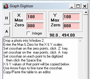 Drop a photo into Window 2, either by: Drag from Windows Explorer & Drop into Window 2, or Copy from another program & Paste in Win 2. Use a big size image for maximum quality. Enter the Zero & Max values for the X & Y scales of the graph in the pink boxes at top of window 1. Set the Crosshair on the Zero Point of the graph. (usually the bottom left of the graph) Click mouse to lock the crosshair, then fine tune with arrow keys. Then click the Z key to log the Zero Point. Set the Crosshair on the Max Point of the graph. (usually the top right of the graph) Click mouse to lock the crosshair, then fine tune with arrow keys. Then click the A key to log the Max Point. Note: Zero & Max can be any convienent location on the chart, they don't have to be the displayed min or max, or even the same scale. Points can go beyond the Zero and Max points. Digitize Points Convert chart points into a table of (X,Y) values.To Digitize the points of the graph: Set the Crosshair on the point to be digitized, the click mouse to lock the crosshair, then fine tune with arrow keys. To save that point, click the Space Bar - the X & Y values of the chart scale will be calculated and copied to the memo. The H button pops up the Help screen. The A button pops up advanced cursor functions. This can automate the curve following functionality. This does not save the results. Text can be copied from the notepad to an editor by highlighting the text then press Ctrl-C to copy to clipboard, then Ctrl-V in the editor or spreadsheet to paste.