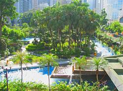 After about a half hour in the steamy bird cage we continued east past the lotus pond, waterfall and conservatory, to the parkside cafe. The chicken linguine was wonderful, but it was missing the chicken (I had them add some). So we finished our beers and then took a stroll through the Pacific Center Mall, which like malls everywhere is nothing but women's clothes and jewelry. Just next door is my favorite building in Hong Kong, the Lippo Center, a rugged looking highrise of black sculptured windows. So as we passed through we stopped in the lobby for an iced latte and watched the traffic zoom by from the giant windows.